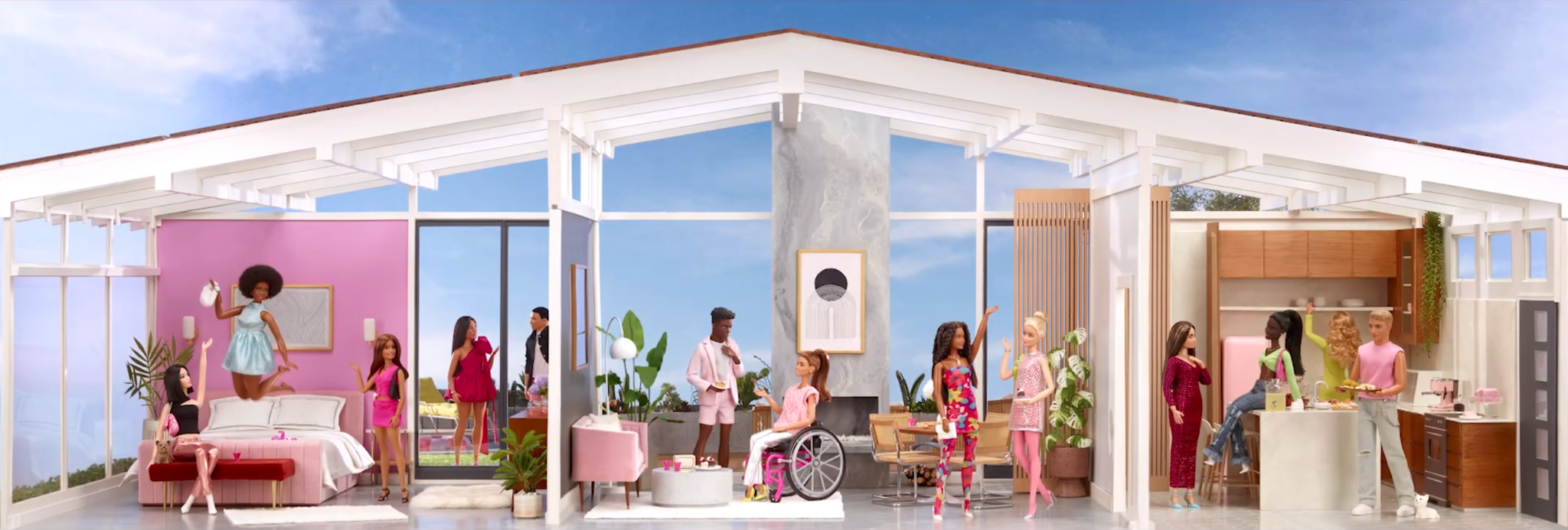 It's essentially a modular photography stage disguised as a dreamhouse. Every wall is camera-ready. The sightlines are built for exactly what we do, the diagonal roofline pulling your eye across the whole scene, the vertical frames dividing it into usable rooms. It's not just a pink plastic mansion. It's a sunlit modernist Barbie pavilion where every angle works.